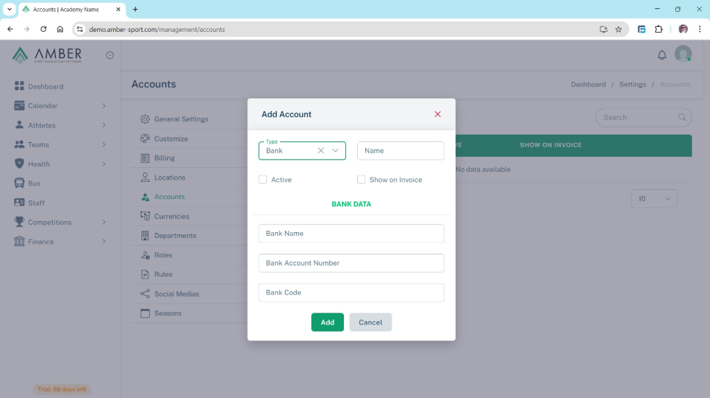 Create and manage the financial accounts used by your sports organization. You can set up cash accounts for internal operations or bank accounts for official transactions such as payments, memberships, and sponsorships.