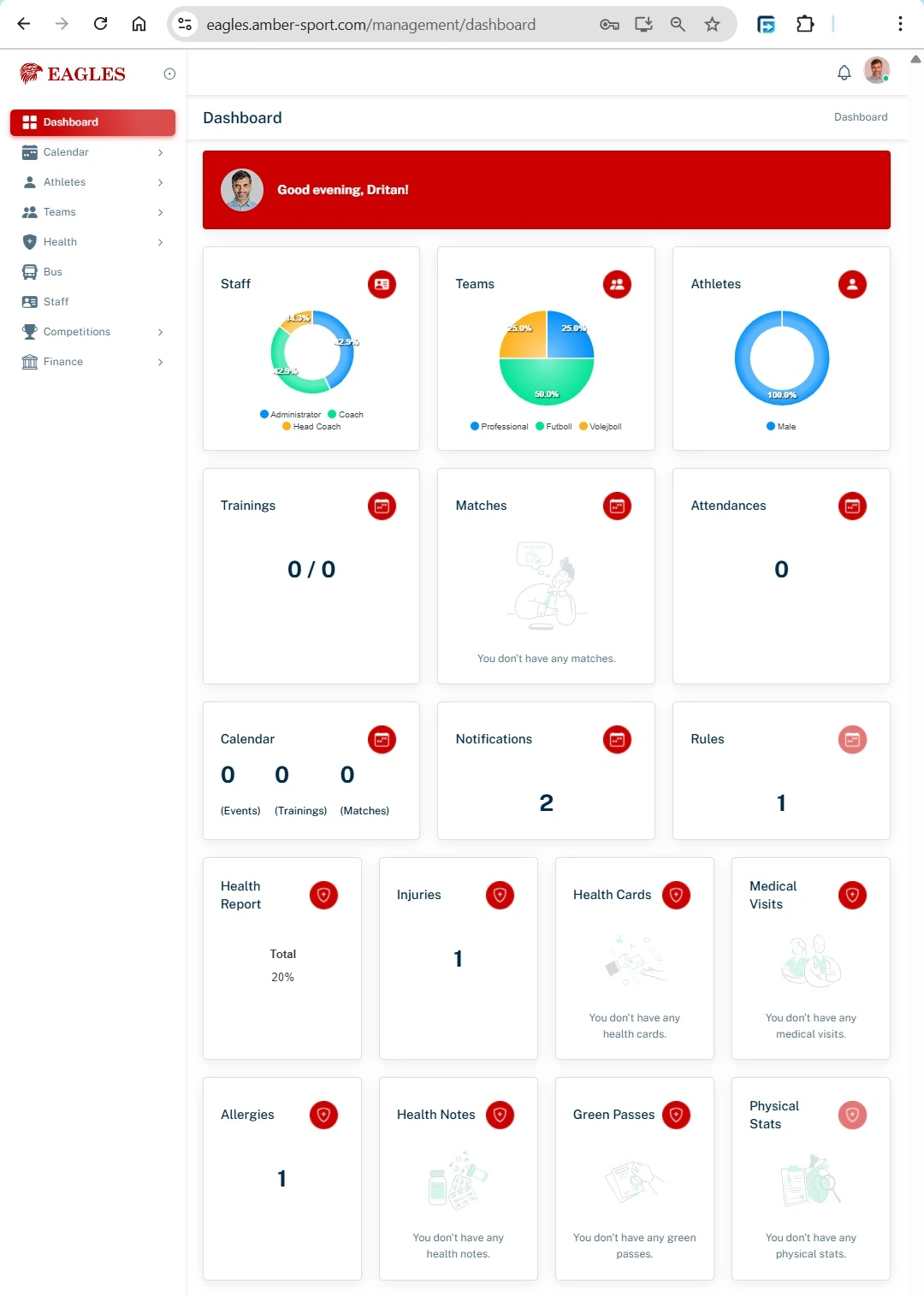 Your Dashboard is the first page you see after logging into Amber Sport. It provides a quick overview of your organization, teams, athletes, trainings, competitions, and other key data.
